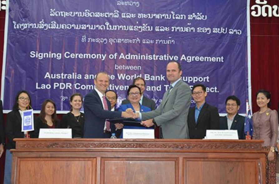 ພິທີເຊັນສັນຍາທຶນການຊ່ວຍເຫຼືອລ້າ ລະຫວ່າງລັດຖະບານອົດສະຕຣາລີ ແລະ ທະນາຄານໂລກ ສຳລັບໂຄງການສົ່ງເສີມຄວາມສາມາດໃນການແຂ່ງຂັນ ແລະ ການຄ້າຂອງ ສປປ ລາວ ຈັດຂຶ້ນວັນທີ 8 ກຸມພາ 2019 ຢູ່ກະຊວງອຸດສາຫະກຳ ແລະ ການຄ້າ ລະຫວ່າງທ່ານ ຈ໋ອງເບີນາລ໌ ຄາຣາສໂກ ເອກອັກຄະລັດຖະທູດອົດສະຕຣາລີ ປະຈຳລາວ ແລະ ທ່ານ ນິໂຄຣາ ພົນທາລາ ຜູ້ບໍລິຫານທະນາຄານໂລກປະຈຳລາວ ມີທ່ານນາງ ເຂັມມະນີ ພົນເສນາ ລັດຖະມົນຕີກະຊວງອຸດສະຫະກຳ ແລະ ການຄ້າ ພ້ອມດ້ວຍພາກສ່ວນກ່ຽວຂ້ອງເຂົ້າຮ່ວມ.